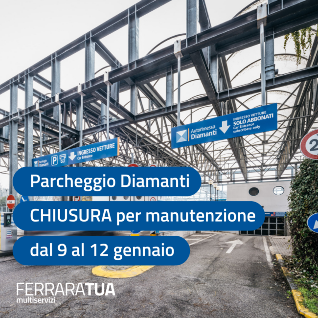 Parcheggio Diamanti chiuso per lavori di manutenzione dal 9 al 12 gennaio Ferrara Tua informa che per consentire i lavori di manutenzione straordinaria alla struttura, il Parcheggio Diamanti rimarrà chiuso dal 9 al 12 Gennaio. Chi è in possesso di un abbonamento in corso di validità, potrà parcheggiare gratuitamente in strada – nelle strisce blu…