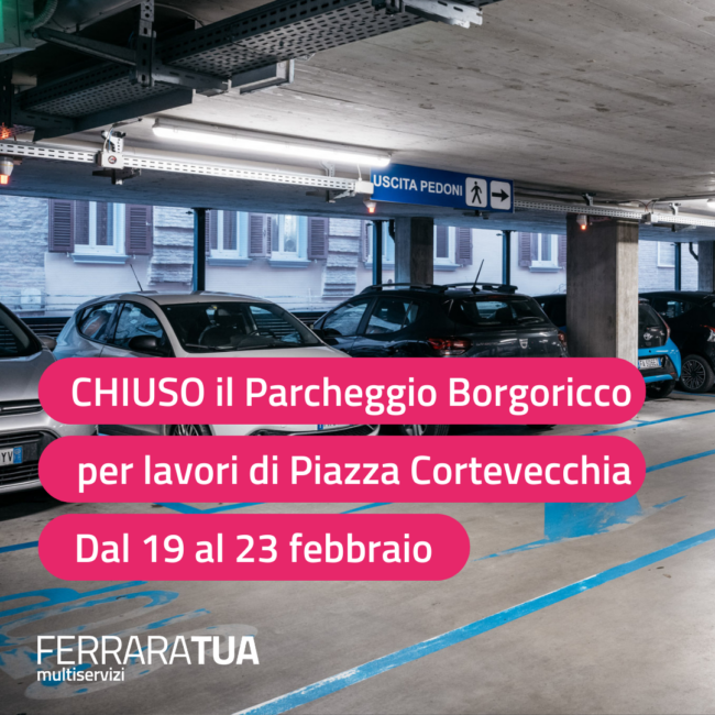 Chiusura Parcheggio Borgoricco dal 19 al 23 Febbraio per lavori di riqualificazione di Piazza Cortevecchia Ferrara Tua informa che, per consentire i lavori di riqualificazione di Piazza Cortevecchia, il Parcheggio Multipiano Borgoricco sarà chiuso dal 19 al 23 Febbraio. 𝐕𝐢𝐚𝐛𝐢𝐥𝐢𝐭𝐚̀ 𝐞 𝐜𝐢𝐫𝐜𝐨𝐥𝐚𝐳𝐢𝐨𝐧𝐞: le vie Borgoricco e Cortevecchia saranno completamente chiuse al traffico. Lungo Via Boccacanale di…