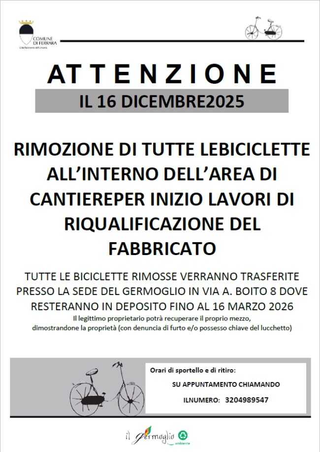 VIABILITA’ – Dal 16 dicembre 2025 la rimozione delle biciclette dall’area tra le vie Felisatti-Costituzione-San Giacomo e piazzale della Stazione