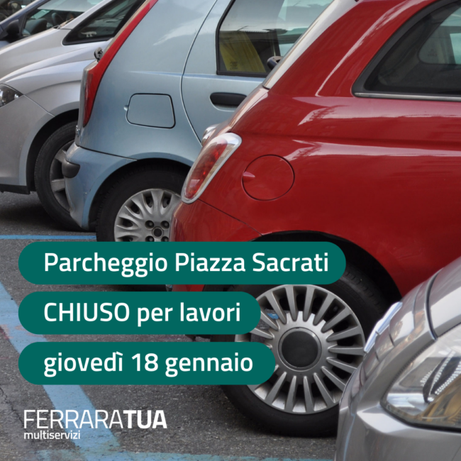 Giovedì 18 Gennaio il Parcheggio Piazza Sacrati resterà chiuso per lavori di manutenzione straordinaria Ferrara Tua informa che per consentire i lavori di manutenzione straordinaria delle essenze arboree poste a dimora in Piazza Sacrati, il parcheggio Piazza Sacrati resterà chiuso nella giornata di giovedì 18 Gennaio. Per ulteriori informazioni, contattare il Front Office Parcheggi di…