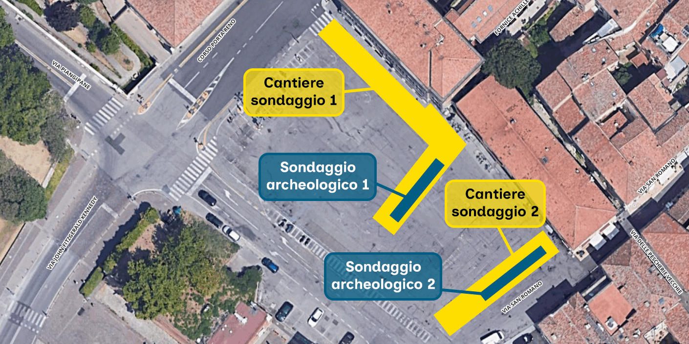 I sondaggi verranno realizzati in due fasi con due trincee di sondaggio ognuna di lunghezza 16 metri e di larghezza 2 metri, con una profondità massima di 1,5 metri. La prima trincea verrà posizionata nella zona centrale della piazza e accompagnata da un’area cantiere che si svilupperà in orizzontale, utile al posizionamento dei mezzi e delle strumentazioni. La seconda verrà realizzata in prossimità di via San Romano, in senso perpendicolare a Piazza Travaglio accompagnata sempre da area di cantiere di pertinenza. La scelta delle due aree di scavo è stata fatta evitando di insistere sui sottoservizi, al fine di non interferire con gli stessi durante i lavori di sondaggio e cercando allo stesso tempo di coprire le zone indicativamente più sensibili in riferimento al possibile tracciato delle mura bassomedievali. I due scavi, secondo le previsioni dei tecnici, dovrebbero avere una durata complessiva di circa 10-15 giorni ciascuno e verranno realizzati, uno di seguito all’altro, a partire, appunto dal prossimo giovedì. Inevitabile qualche disagio per la riduzione (temporanea) dei posti auto e per il riposizionamento di alcuni banchi dei mercati del lunedì, del venerdì e giornaliero situati in corrispondenza degli scavi.